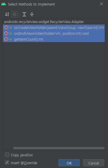 여기있는 메소드를 다 생성해주고 빨간줄이 생기는 경우 전부 Alt + Enter를 해서 지워주면 된다.