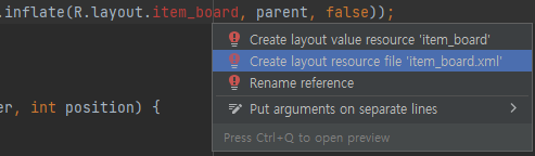 그러면 이렇게 item_board에 빨간줄이 뜨는데 Alt + Enter를 눌러서 xml을 생성해주면 된다.