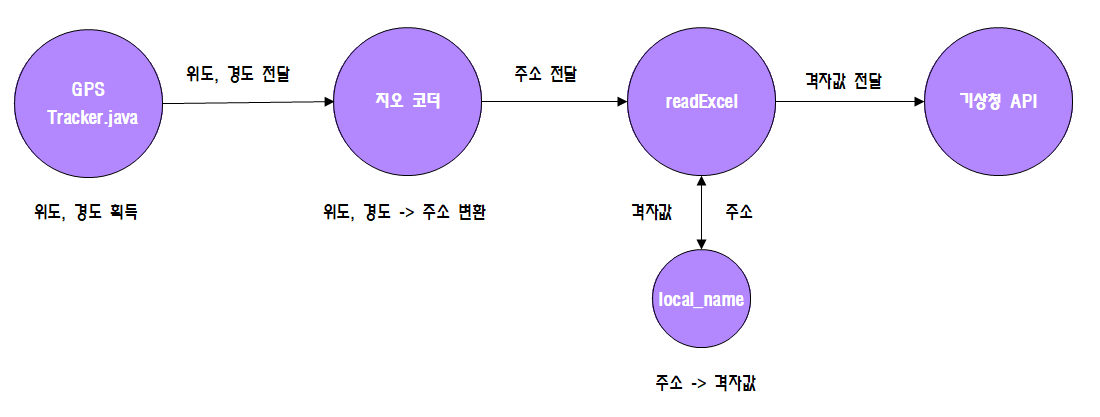 GPS를 통해 현재 위치의 위도, 경도를 받아오고 이를 지오코더를 통해 현재 위치의 주소로 전환해준다.